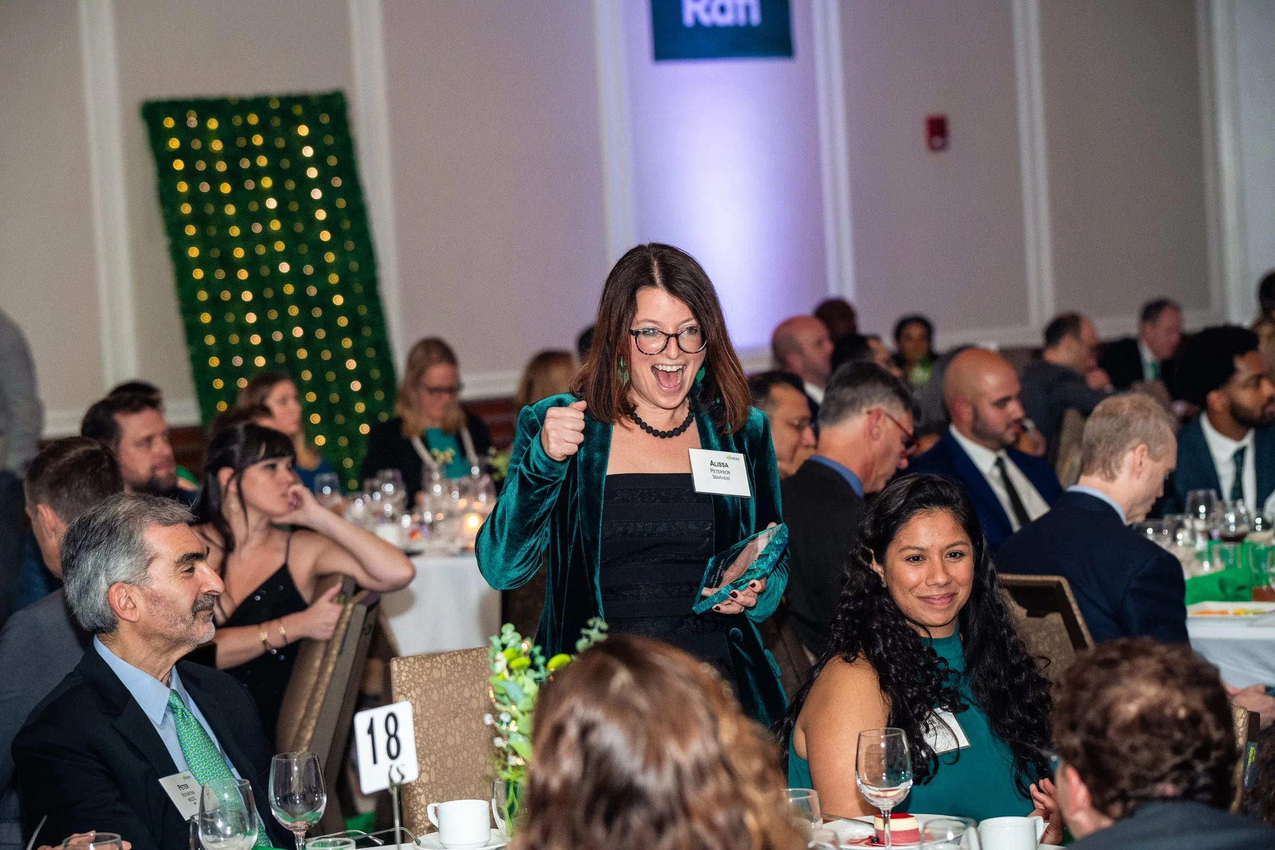 Alissa Peterson, cofounder and CEO, celebrates SeaAhead’s win as Startup Supporter of the Year at New England Clean Energy Center’s 14th Annual Green Future Gala on October 26, 2023.