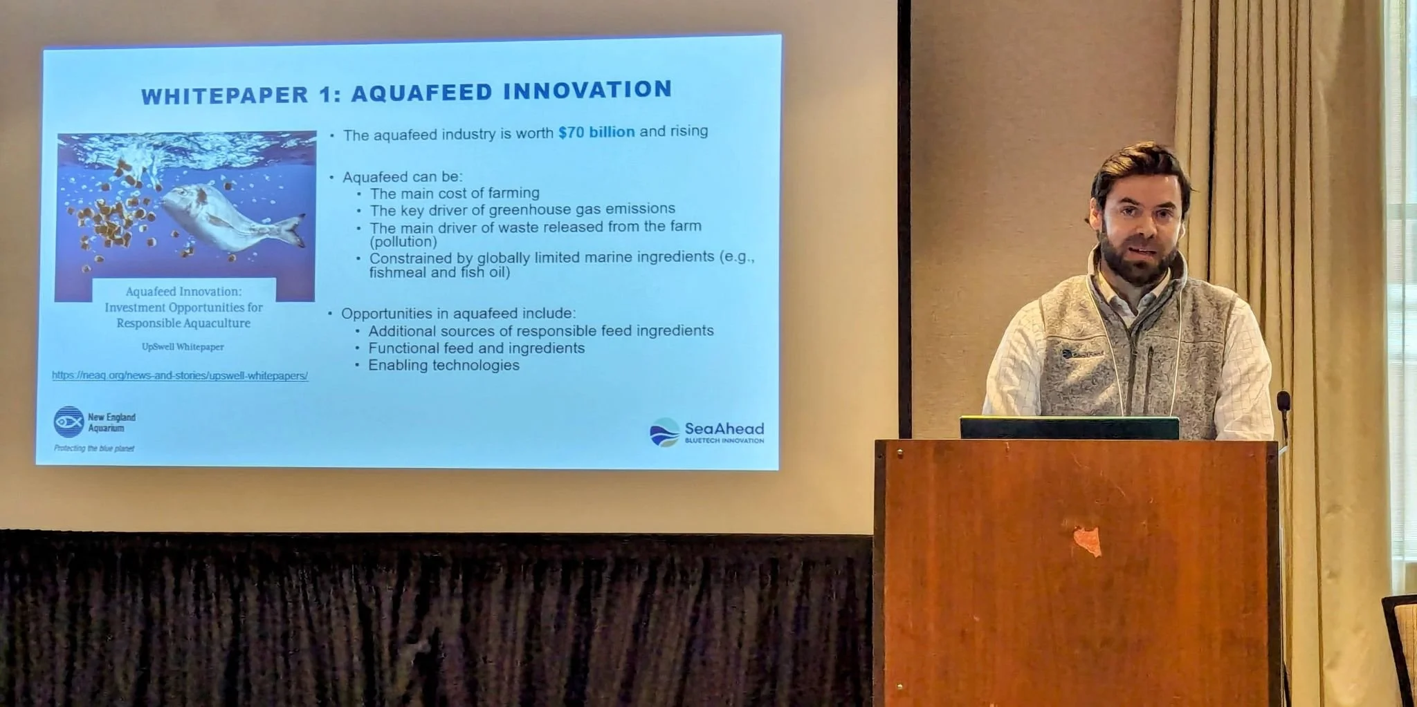 SeaAhead’s Principal, Luke Sawitsky, speaks about the company’s aquafeed innovation whitepaper written in partnership with the New England Aquarium at the Northeast Aquaculture Conference & Exposition (NACE) in Providence, Rhode Island on January 11, 2024. Photo credit: Beck Hayes