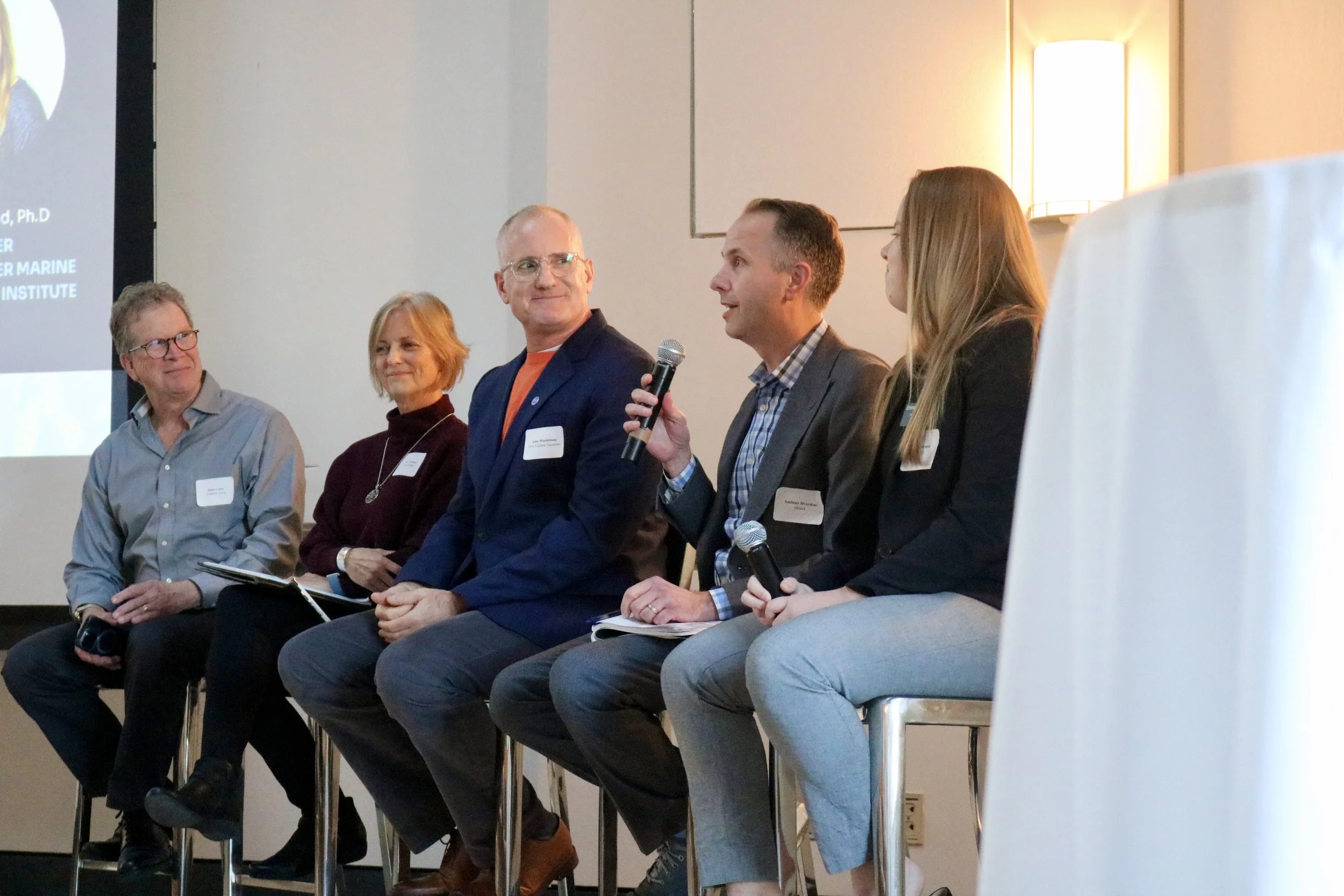Drew Carey, left, moderates a panel of experts discussing biodiversity at SeaAhead’s Innovation in Offshore Wind event on November 29, 2023. Photo credit: Ryan Green