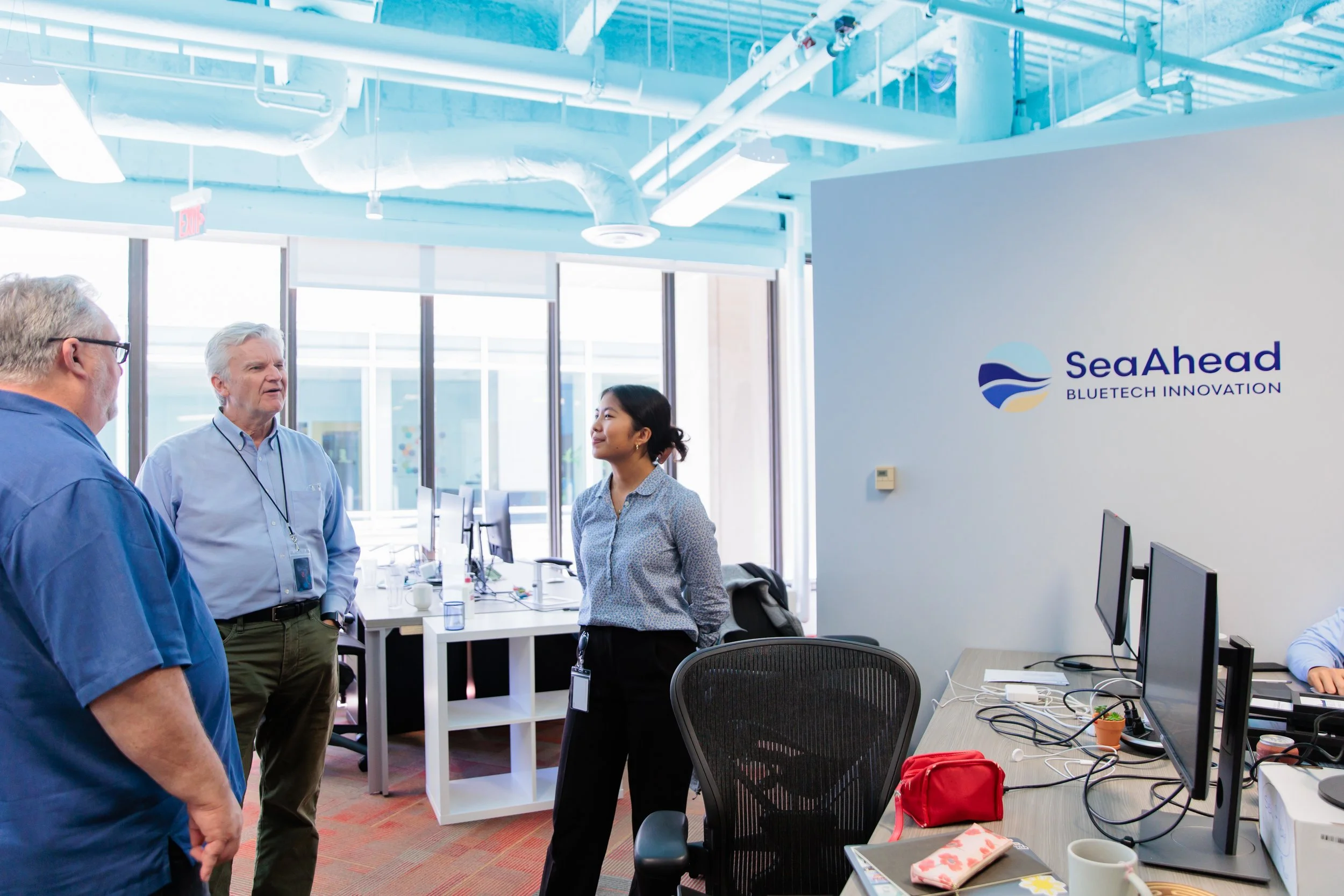 Julia Pangan, SeaAhead’s BlueSwell program manager, chats with Cohort IV founders Joe Wheeler (middle) and Craig Harper (left) about their startup bluemvmt. Photo Credit: Allegro Photography LLC